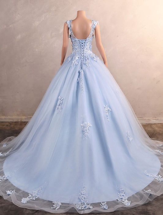 Ball Gown Quinceanera Dresses Maxi Dress Performance Sweep / Brush Train Short Sleeve V Neck Tulle