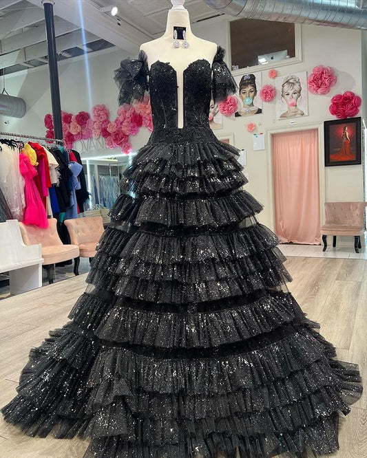 Regular price $219.99 USDRegular priceUnit price / per$299.99 USDSale price $219.99 USDSaleBall Gown Strapless Tulle Tiered Long Prom Dresses Off Shoulder Sparkly