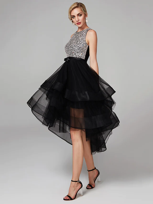 Regular price $159.99 USDRegular priceUnit price / per$239.99 USDSale price $159.99 USDSaleBall Gown Sparkle & Shine High Low Keyhole Cocktail Party Prom Dress Jewel Neck Sleeveless Knee Length Satin Tulle with Beading Cascading