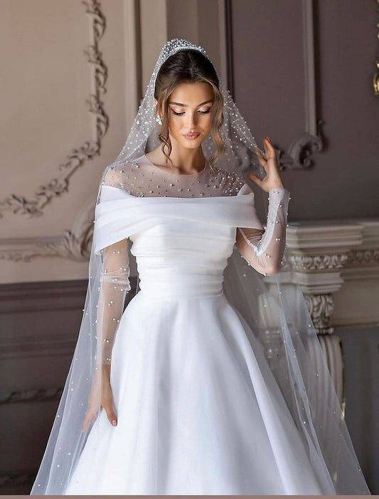Regular price $189.99 USDRegular priceUnit price / per$269.99 USDSale price $189.99 USDSaleBeach Little White Dresses Formal Wedding Dresses A-Line Illusion Neck Long Sleeve Floor Length Tulle Bridal Gowns With Ruched