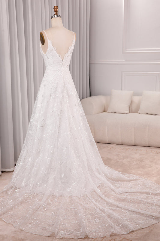 Regular price $183.99 USDRegular priceUnit price / per$263.99 USDSale price $183.99 USDSaleIvory A Line Spaghetti Straps Lace Chapel Train Sparkly Bridal Dresses With Slit V-neck