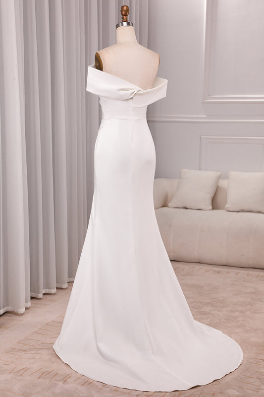 Regular price $145.99 USDRegular priceUnit price / per$225.99 USDSale price $145.99 USDSaleIvory Mermaid Straight Neck Sweep Train Satin Bridal Dress with Slit Off Shoulder
