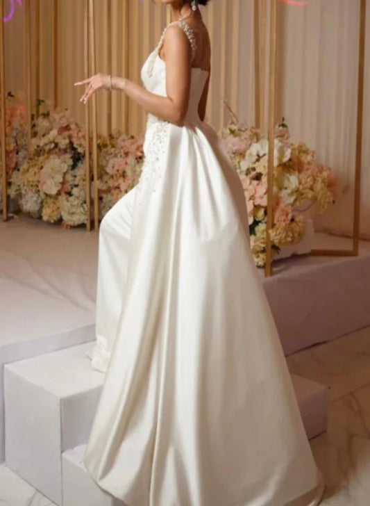 Luxury Satin Wedding Dress Beaded One Shoulder Bridal Dress With Panel Train Floor Length Elegant