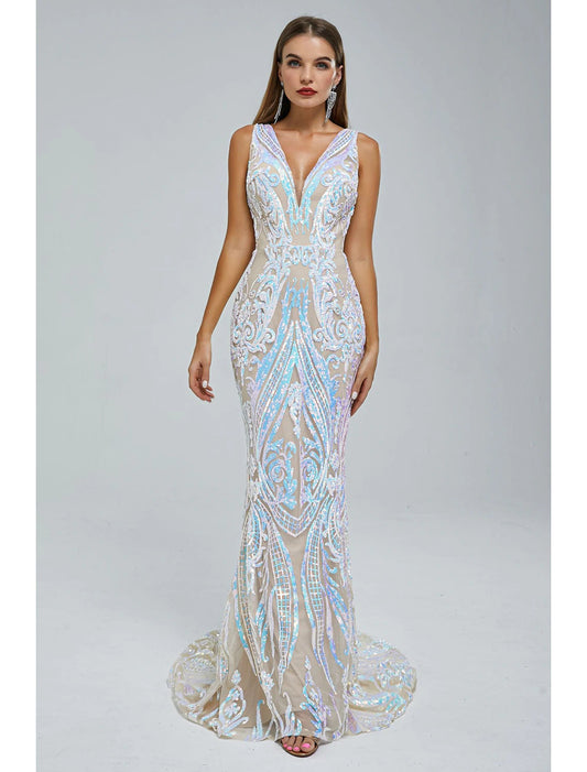 Mermaid / Trumpet Evening Gown Sparkle & Shine Dress Formal Court Train Sleeveless V Neck Sequined Backless