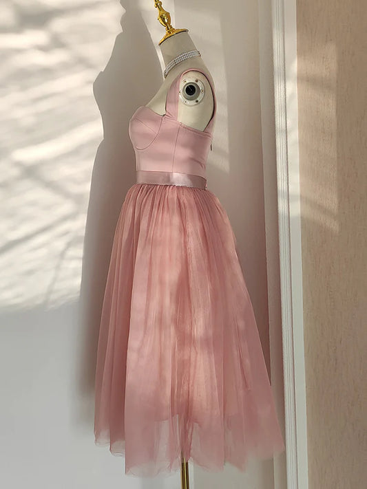 Pink Tea Length Sweetheart Tulle Party Dresses Wedding Party Dresses Formal Dress Homecoming Dress Without Neck accessories