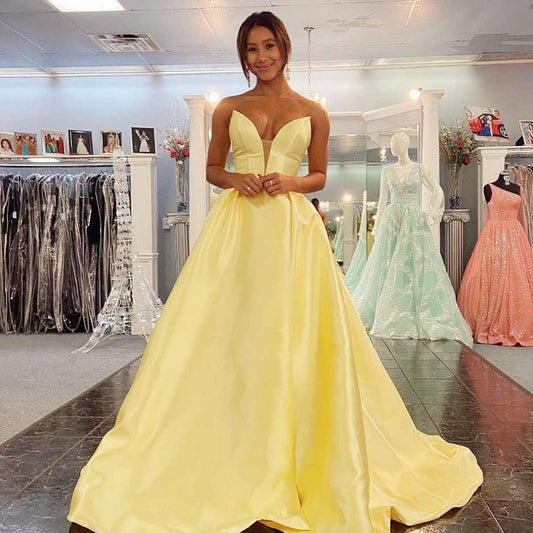 Regular price $115.99 USDRegular priceUnit price / per$195.99 USDSale price $115.99 USDSalePlus Size A-Line Satin Strapless Prom Dress with Slit V-neck Sexy Evening Dresses