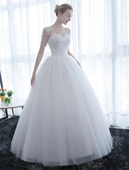 Reception Formal Wedding Dresses Ball Gown Illusion Neck Half Sleeve Floor Length Lace Bridal Gowns
