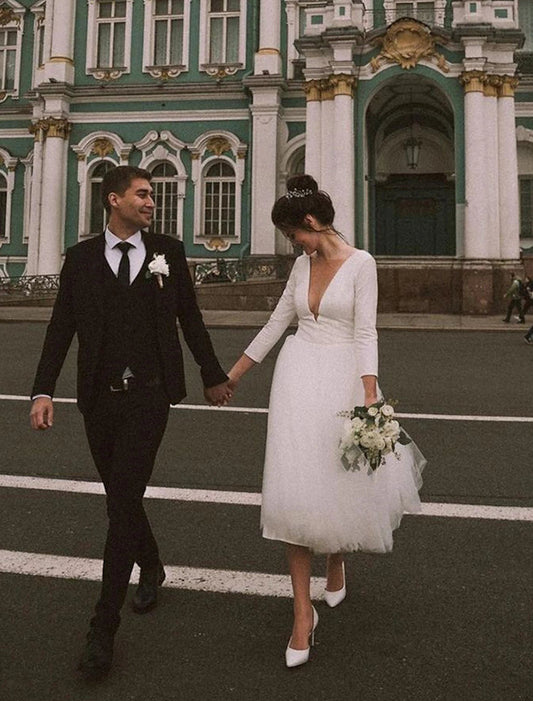 Regular price $129.99 USDRegular priceUnit price / per$209.99 USDSale price $129.99 USDSaleReception Vintage 1940s / 1950s Little White Dresses Wedding Dresses A-Line V Neck Long Sleeve Tea Length Satin Bridal Gowns
