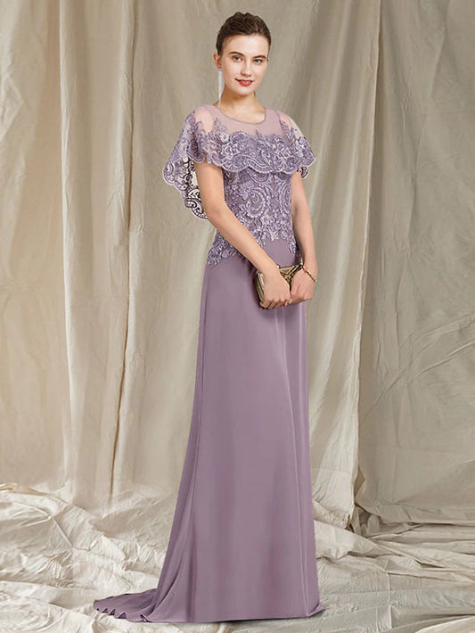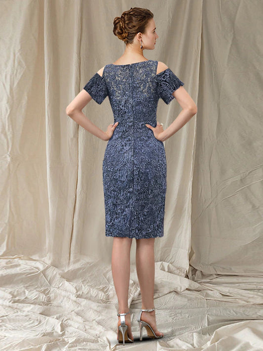 Sheath / Column Mother of the Bride Dress Elegant Jewel Neck Knee Length Chiffon Lace Short Sleeve