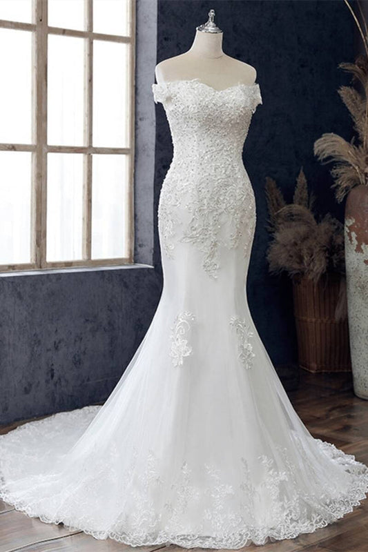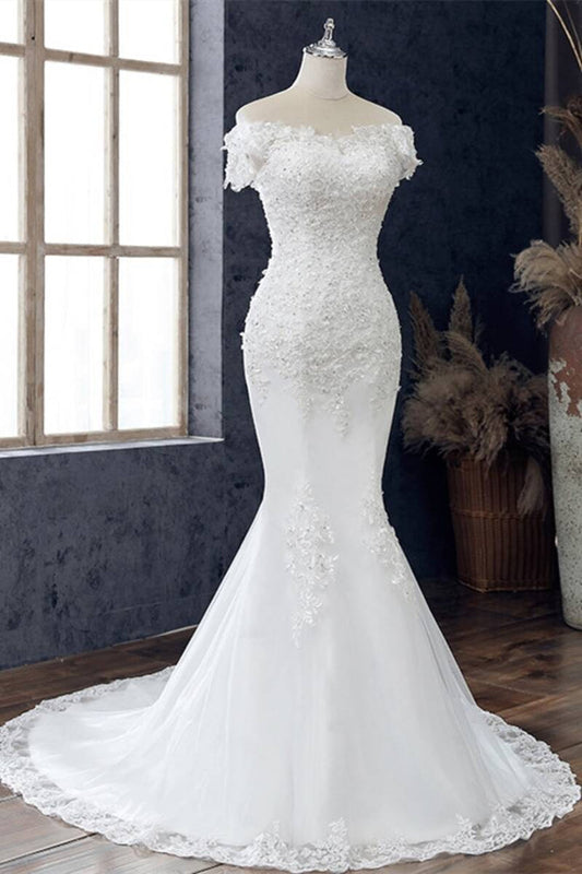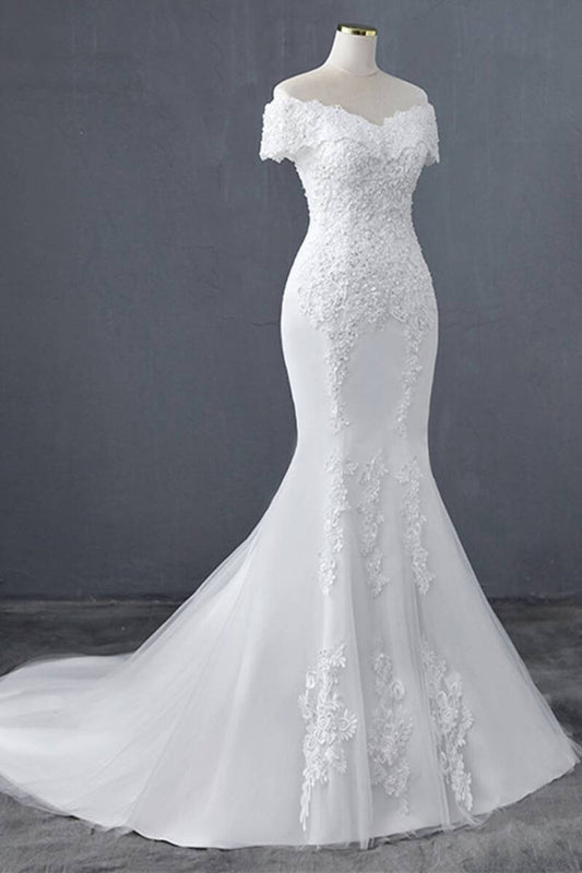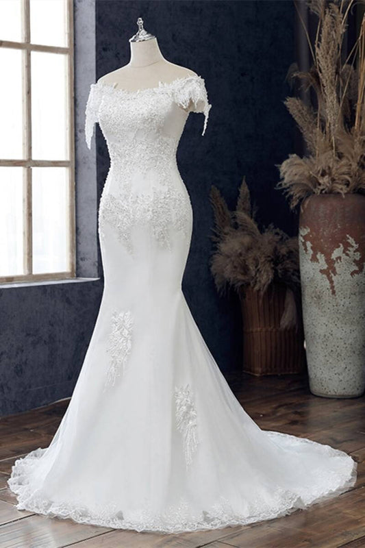 Regular price $235.99 USDRegular priceUnit price / per$315.99 USDSale price $235.99 USDSaleWhite Appliques Off-the-Shoulder Cap Sleeve Trumpet Wedding Dress Long