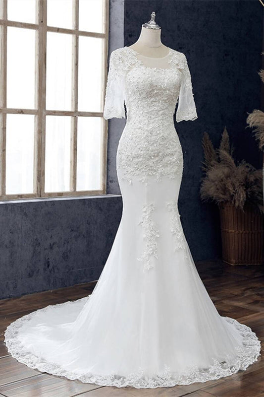 Regular price $248.99 USDRegular priceUnit price / per$328.99 USDSale price $248.99 USDSaleWhite Appliques Jewel Half Sleeve Mermaid Wedding Dress Long