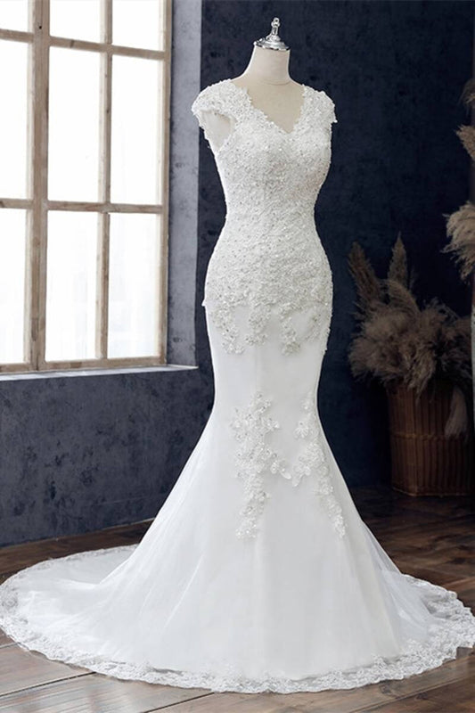 Regular price $188.99 USDRegular priceUnit price / per$268.99 USDSale price $188.99 USDSaleWhite Appliqués V-Neck Cap Sleeve Trumpet Wedding Dress Long