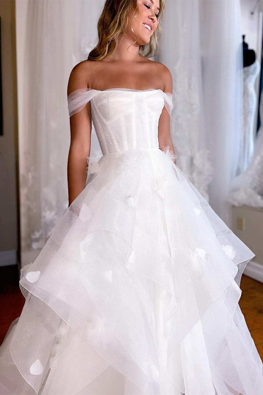 Regular price $158.99 USDRegular priceUnit price / per$238.99 USDSale price $158.99 USDSaleWhite Off-the-Shoulder Tiered A-Line Wedding Dress with Flowers Beautiful