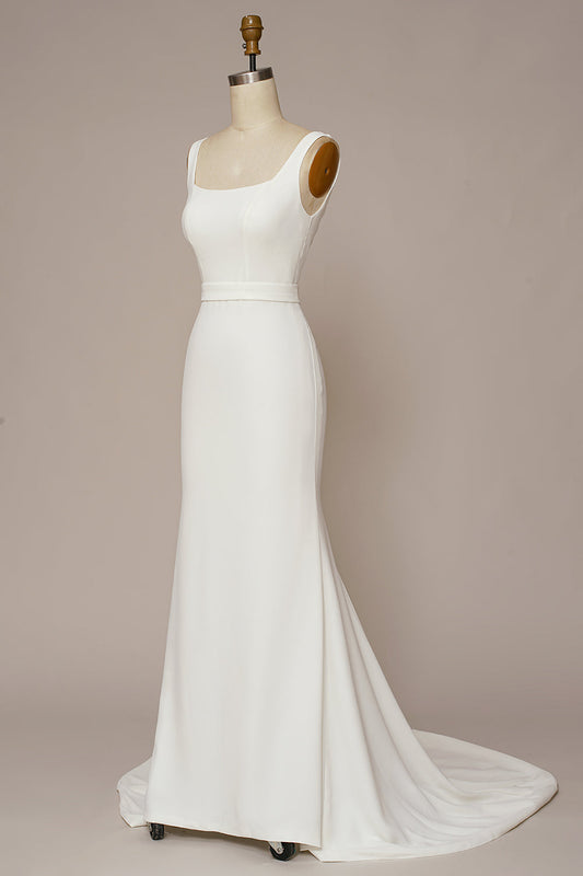 White Mermaid Square Neck Sweep Train Satin Wedding Dress Long