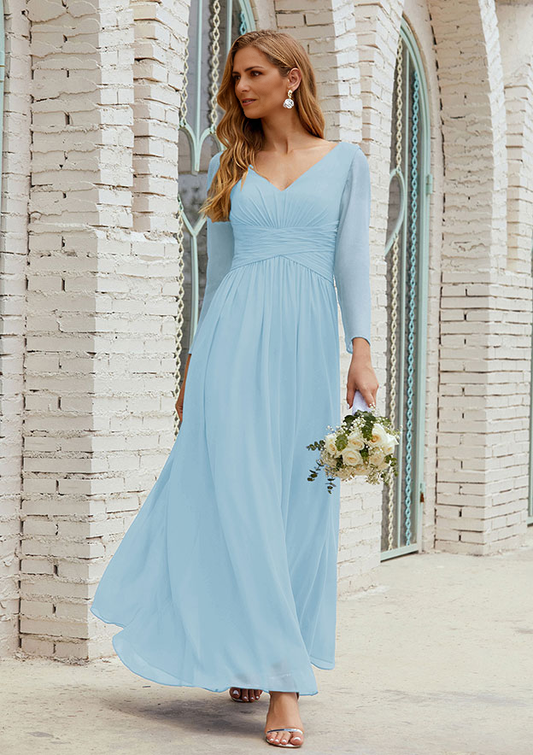 A-line V Neck FullLong Sleeve Ankle-Length Chiffon Mother of the Bride Dress With Pleated Pure Color