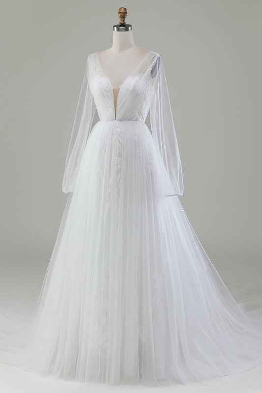 Regular price $175.99 USDRegular priceUnit price / per$255.99 USDSale price $175.99 USDSaleA-Line V-Neck Tulle Sweep Train Wedding Dress With Long Sleeves Sexy