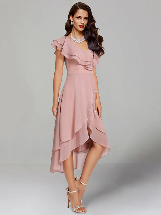 Regular price $117.99 USDRegular priceUnit price / per$197.99 USDSale price $117.99 USDSaleA-Line Wedding Guest Dresses Casual Dress Party Dress Wedding Party Asymmetrical Short Sleeve V Neck Bridesmaid Dress Chiffon with Ruffles