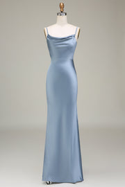 Dusty Blue Sheath Spaghetti Straps Long Satin Bridesmaid Dress