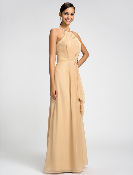 Sheath / Column Bridesmaid Dress Halter Neck Sleeveless Floor Length Chiffon with Pleats / Ruched