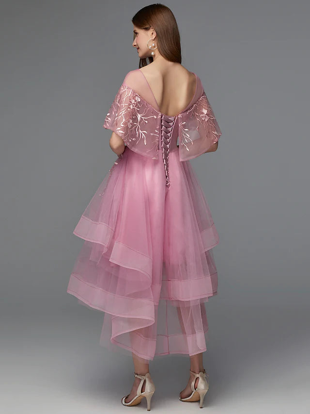 A-Line Elegant Dress Holiday Asymmetrical Sleeveless Illusion Neck Lace Tie Back with Lace - US 2 / UK 6 / EU 32
