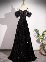 Spaghetti Straps Off Shoulder A-Line Prom Dress Shiny Black Evening Gown Sparkly