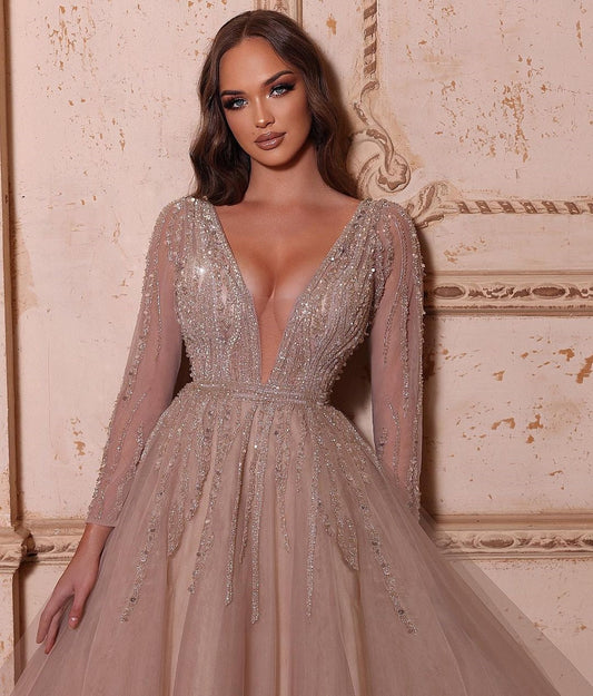 Regular price $149.99 USDRegular priceUnit price / per$229.99 USDSale price $149.99 USDSaleA-Line V-Neck Long Sleeves Tulle Crystal Sequined Beading Prom Dresses Sexy Evening Dresses