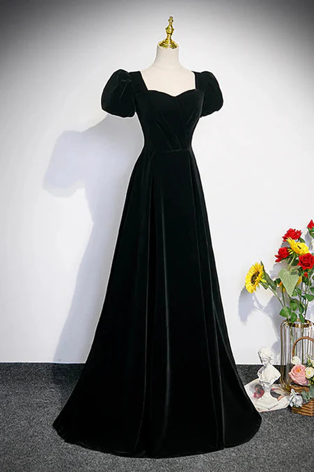 A-line Black Short Sleeves Velvet Long Party Dress Simple Bridesmaid Dress Elegant Evening Dress