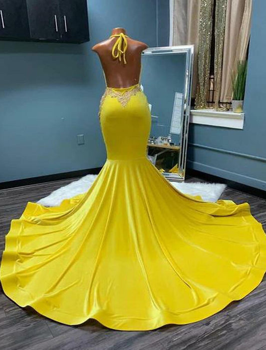 Regular price $115.99 USDRegular priceUnit price / per$195.99 USDSale price $115.99 USDSaleMermaid / Trumpet Evening Gown Backless Dress Formal Chapel Train Sleeveless Halter African American Imitation Silk with Crystals