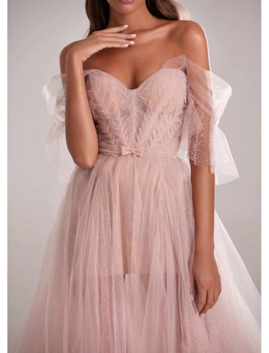 Regular price $123.99 USDRegular priceUnit price / per$203.99 USDSale price $123.99 USDSaleA-Line Prom Dresses Elegant Dress Wedding Guest Floor Length Short Sleeve Off Shoulder Tulle with Pleats