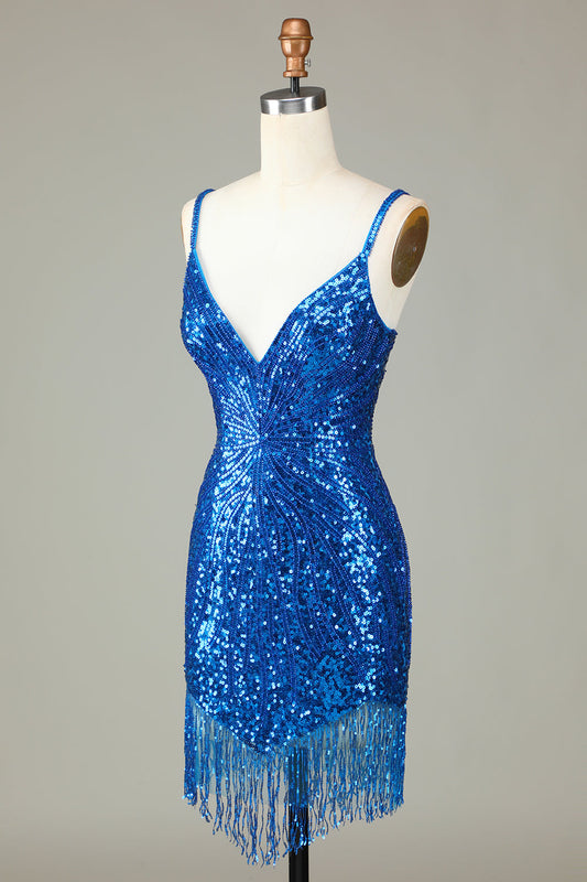 Regular price $129.99 USDRegular priceUnit price / per$209.99 USDSale price $129.99 USDSaleSparkly Bodycon Spaghetti Straps Blue Sequins Short Homecoming Dress With Tassel Sexy