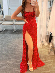 Mermaid / Trumpet Prom Dresses Sparkle & Shine Dress Wedding Guest Party Wear Floor Length Sleeveless Spaghetti Strap Sequined with Sequin Slit