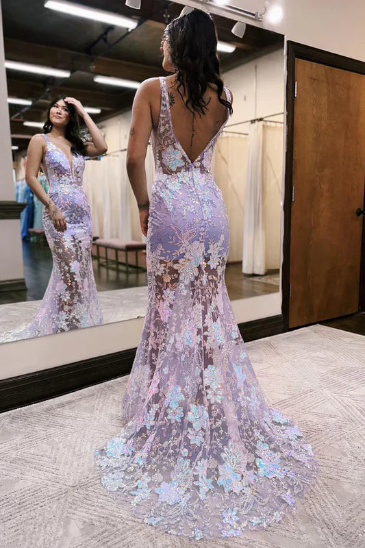 V Neck Mermaid Sequin Lace Long Prom Dresses Sexy Evening Dress With Flowers