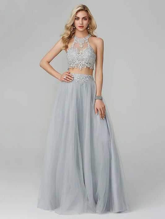 Regular price $149.99 USDRegular priceUnit price / per$229.99 USDSale price $149.99 USDSaleTwo Piece Empire Prom Formal Evening Dress Halter Neck Sleeveless Floor Length Lace