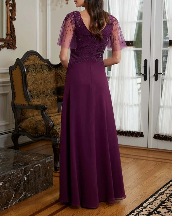 A-Line V-Neck Mother of the Bride Dress Beaded Tulle Evening Dresses Wedding Guest Party Dresses
