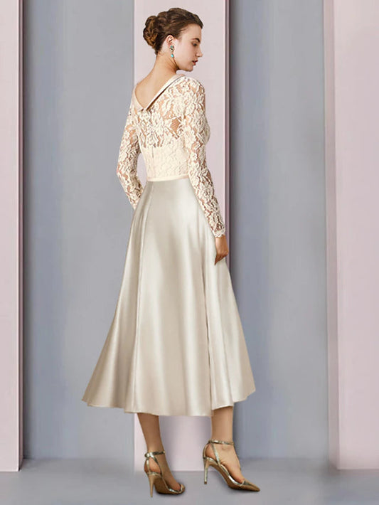 Regular price $121.99 USDRegular priceUnit price / per$201.99 USDSale price $121.99 USDSaleA-Line Mother of the Bride Dress Wedding Guest Elegant Jewel Neck Tea Length Satin Lace Half Sleeve with Bow(s) Pleats