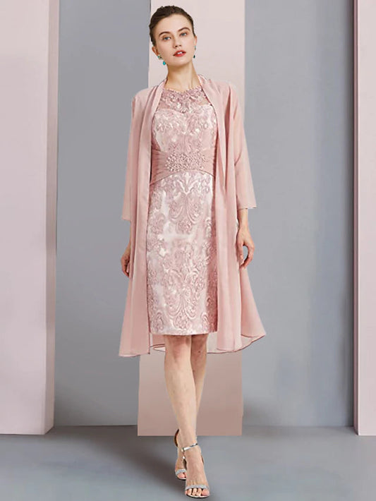 Regular price $119.99 USDRegular priceUnit price / per$199.99 USDSale price $119.99 USDSaleTwo Piece Sheath / Column Mother of the Bride Dress Formal Wedding Guest Elegant Scoop Neck Knee Length Chiffon Lace Sleeveless Jacket Dresses with Beading