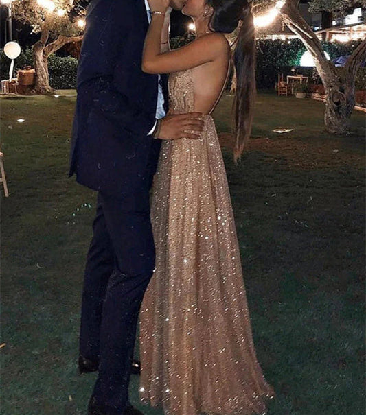 Glittering A-Line/Princess Sequin V-Neck Sweep/Brush Train Long Prom Dresses Sparkly Evening Dresses