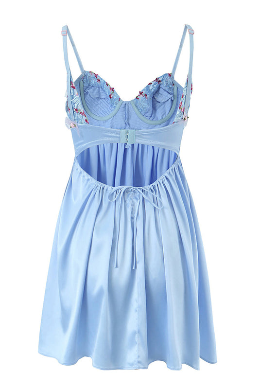 Regular price $116.99 USDRegular priceUnit price / per$196.99 USDSale price $116.99 USDSaleBlue A-Line Spaghetti Straps Backless Graduation Dress With Appliques Short