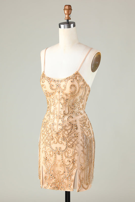 Regular price $149.99 USDRegular priceUnit price / per$229.99 USDSale price $149.99 USDSaleSpaghetti Straps Tight Glitter Golden Homecoming Dress With Beading Sparkly