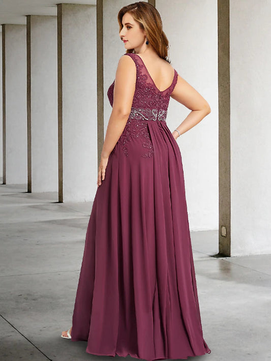 A-Line Mother of the Bride Dress Elegant V Neck Floor Length Chiffon Lace Sleeveless with Pleats
