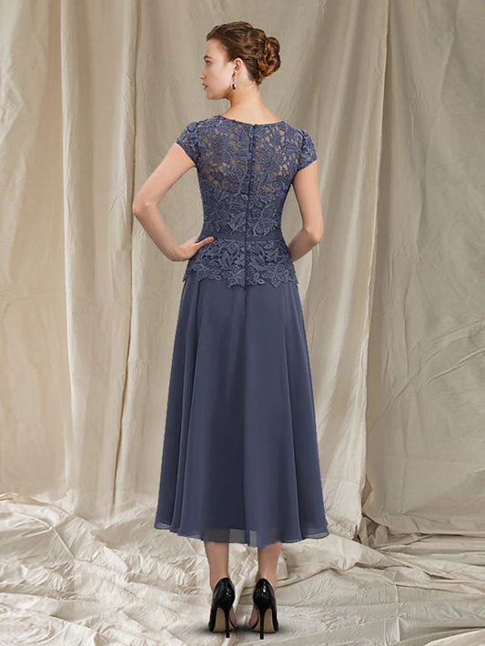 A-Line Mother of the Bride Dress Elegant Jewel Neck Tea Length Chiffon Lace Short Sleeve with Pleats