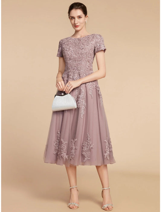 Regular price $115.99 USDRegular priceUnit price / per$195.99 USDSale price $115.99 USDSaleA-Line Mother of the Bride Dress Wedding Guest Elegant Petite Jewel Neck Tea Length Lace Tulle Short Sleeve