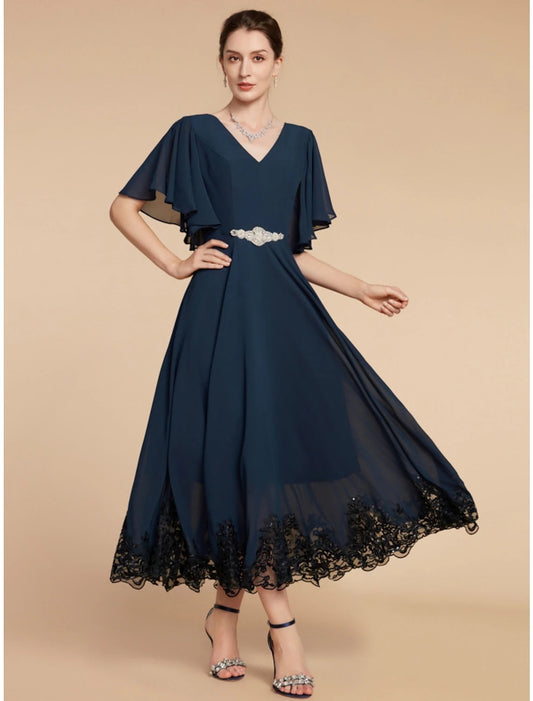 Regular price $125.90 USDRegular priceUnit price / per$205.90 USDSale price $125.90 USDSaleA-Line Mother of the Bride Dress Wedding Guest Elegant Vintage V Neck Ankle Length Chiffon Lace Short Sleeve with Crystal Brooch Ruching