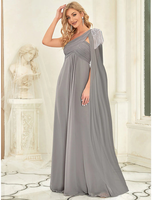 A-Line Evening Gown Empire Dress Wedding Guest Floor Length Sleeveless One Shoulder Chiffon with Crystals Shouder Flower