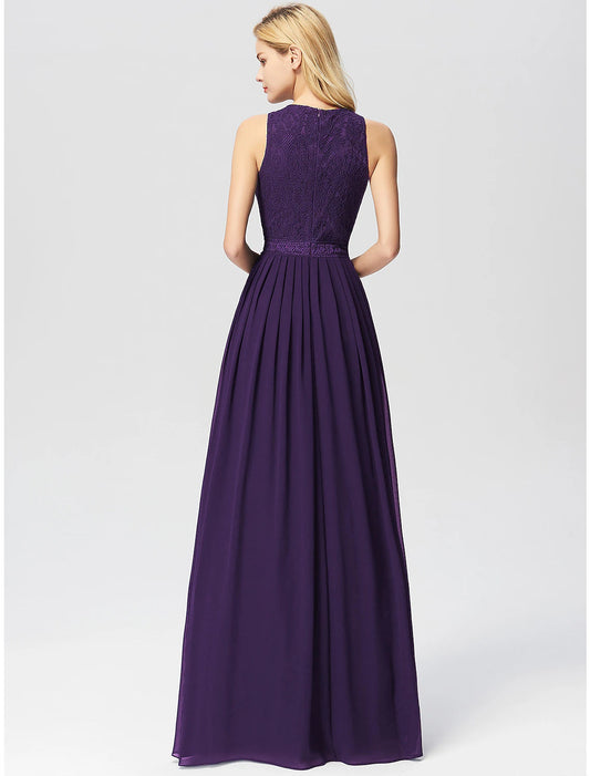 A-Line Prom Dresses Maxi Dress Wedding Guest Floor Length Sleeveless Jewel Neck Chiffon with Pleats