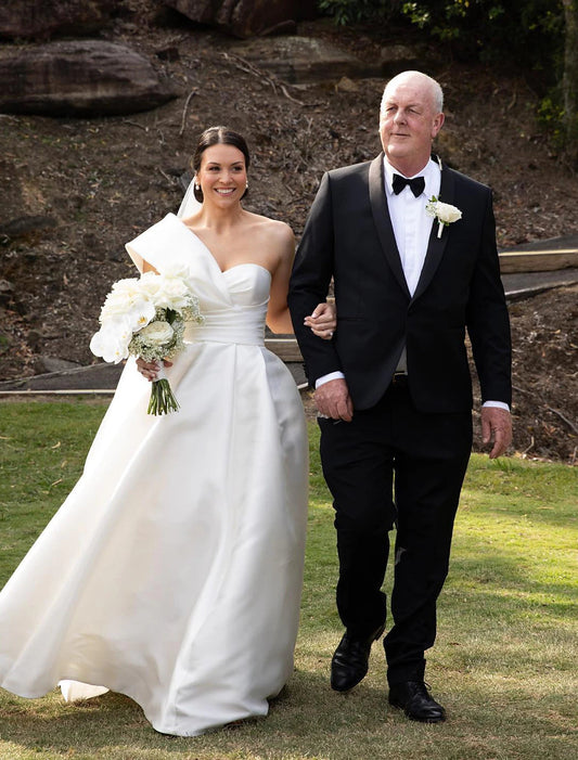 Hall Formal Wedding Dresses A-Line One Shoulder Sleeveless Sweep / Brush Train Satin Bridal Gowns