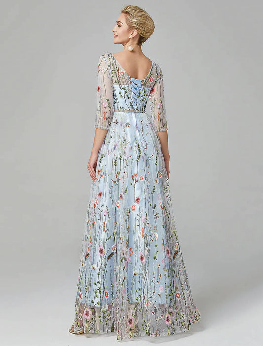 A-Line Evening Gown Elegant Dress Floor Length Sleeve Lace with Embroidery Beautiful Evening Dress
