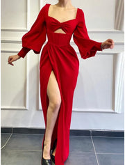A-Line Evening Gown Party Wear Floor Length Long Sleeve Square Neck Wedding Guest Dresses with Slit