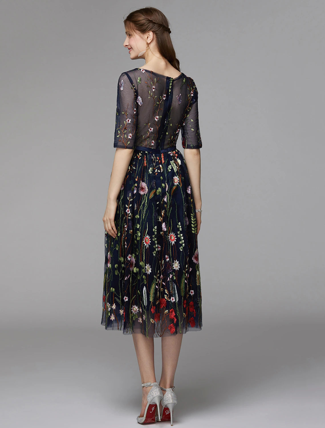 A-Line Party Dress Holiday Tea Length Half Sleeve Illusion Neck Organza with Embroidery - Dark Navy / US 2 / UK 6 / EU 32