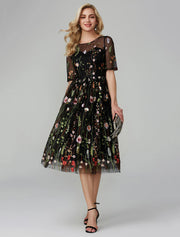 A-Line Party Dress Holiday Tea Length Half Sleeve Illusion Neck Organza with Embroidery